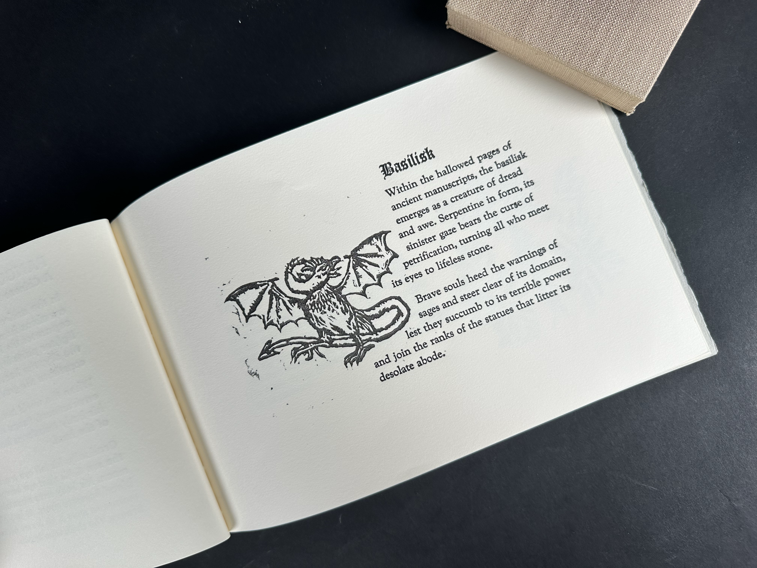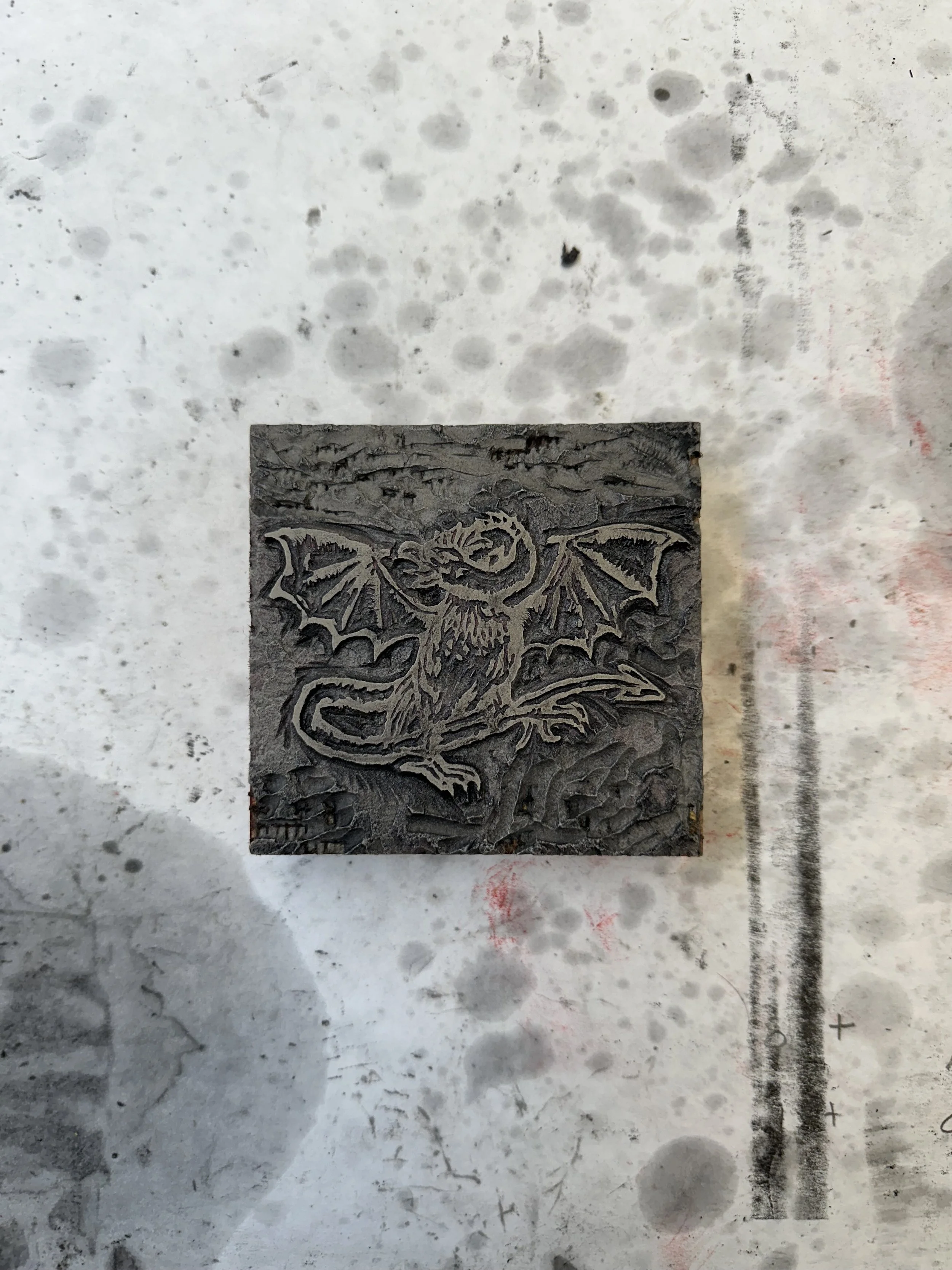 After carving the block, both the text and illustration were locked up in a chase for printing. The final prints were created using a registration template to ensure accurate alignment. The pages were bound using a traditional stab binding method, completing the project with a handcrafted book that reflects the precision and craftsmanship of letterpress printing.